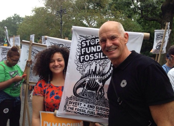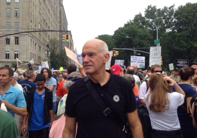 Την Κυριακή ο πρώην πρωθυπουργός έκανε την εμφάνισή του στους δρόμους του «Μεγάλου Μήλου», προκειμένου να συμμετάσχει στη διαδήλωση για την κλιματική αλλαγή. Ο Γ. Παπανδρέου φορούσε ένα μαύρο κοντομάνικο μπλουζάκι και φωτογραφήθηκε με το χαμόγελο στα χείλη, στέλνοντας το δικό του μήνυμα.