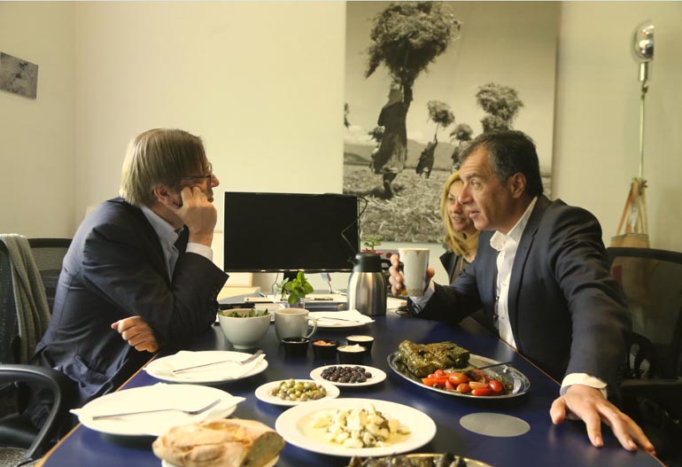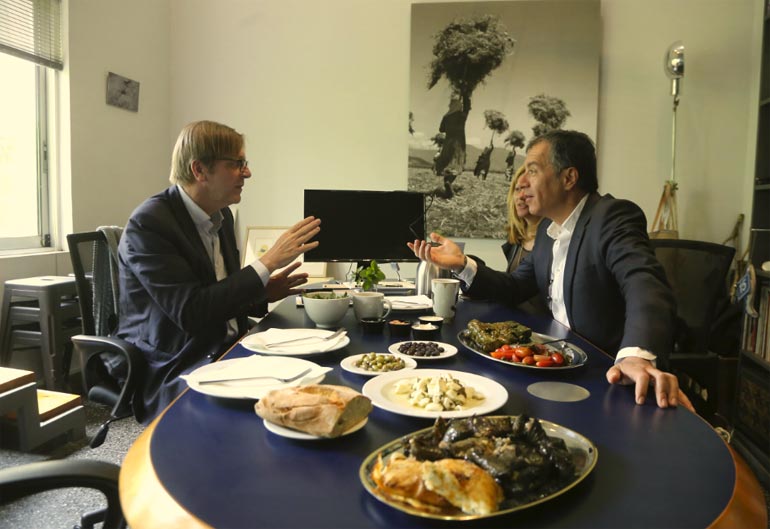 Με ελιές, ψωμί, ντολμαδάκια και άλλα μικροεδέσματα διεξιώθηκε ο Σταύρος Θεοδωράκης τον Γκι Φέρχοφστατ, τον επικεφαλής της κοινοβουλευτικής ομάδας των Φιλελευθέρων Δημοκρατών στο Ευρωκοινοβούλιο.