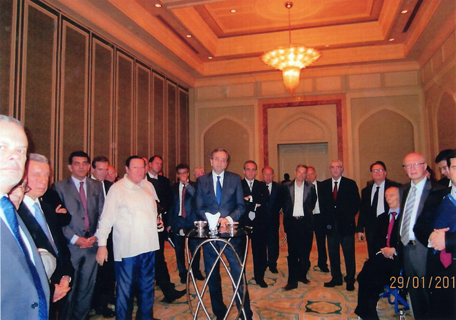 Παρόντες στην σεμνή τελετή οι πολύ γνωστοί businessman του αθηναϊκού ως επί το πλείστον κέντρου. Μην αυταπατάστε ωστόσο. Ο εκ δεξιών του Έλληνα πρωθυπουργού με την λευκή πουκαμίσα δεν είναι ο Εμίρης του Κατάρ ούτε εις εκ των αδελφών του. Πρόκειται μετά βεβαιότητος για τον Έλληνα επιχειρηματία Φίλιππο Βρυώνη.
