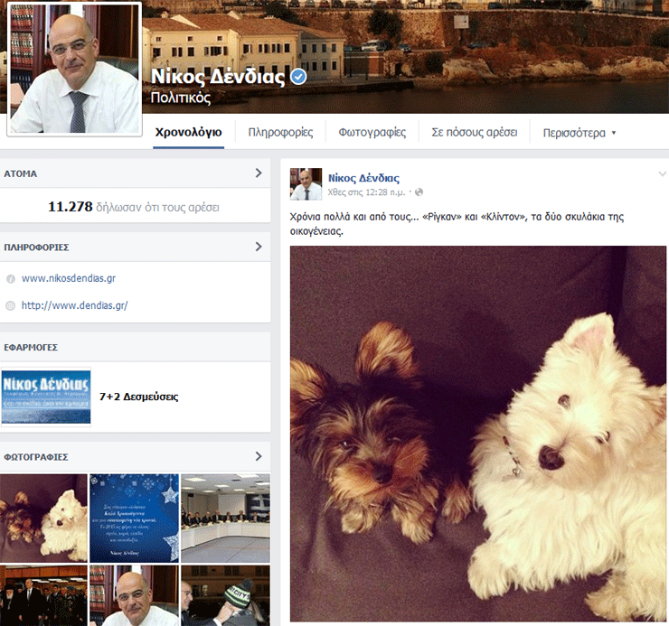 Ο υπουργός, που συχνά πυκνά αναρτά φωτογραφίες και σχόλια στους ιστότοπους κοινωνικής δικτύωσης που διατηρεί, ανέβασε και μια φωτογραφία με τα χαριτωμένα τετράποδα, γράφοντας: «Χρόνια πολλά από τους… “Ρίγκαν” και “Κλίντον”, τα δύο σκυλάκια της οικογένειας».