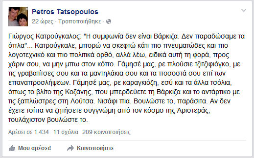 «Γιώργος Kατρούγκαλος: “Η συμφωνία δεν είναι Βάρκιζα. Δεν παραδώσαμε τα όπλα”… Κατρούγκαλε, μπορώ να σκεφτώ κάτι πιο πνευματώδες και πιο λογοτεχνικό και πιο πολιτικά ορθό, αλλά λέω, ειδικά αυτή τη φορά, προς χάριν σου, να μην μπω στον κόπο. Γάμησέ μας, ρε πλούσιε τζιτζιφιόγκο, με τις γραβατίτσες σου και τα μαντηλάκια σου και τα ποσοστά σου επί των επαναπροσλήψεων. Γάμησέ μας, ρε καραγκιόζη, εσύ και τα άλλα τσόλια, όπως το βλίτο της Κοζάνης, που μπερδεύετε τη Βάρκιζα και το αντάρτικο με τις ξαπλώστρες στη Λούτσα. Νισάφι πια. Βουλώστε το, παράσιτα. Αν δεν έχετε τσίπα να ζητήσετε συγγνώμη από τον κόσμο της Αριστεράς, τουλάχιστον βουλώστε το».