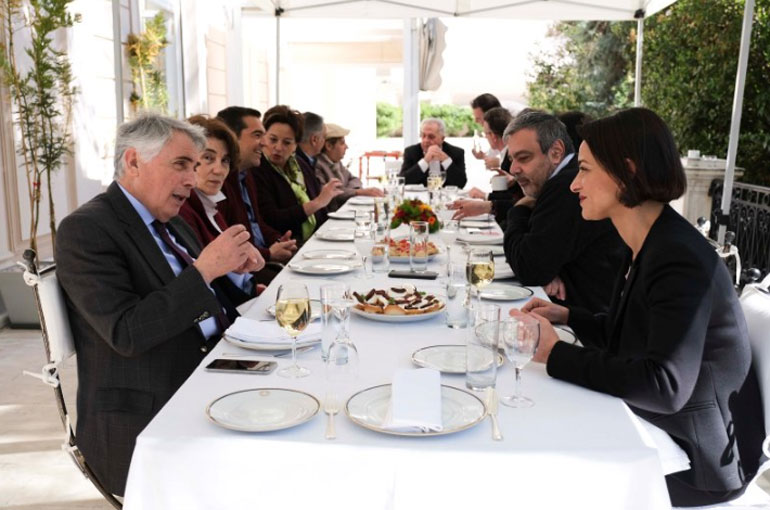 Με τον Αλέκο Φλαμπουράρη εις την κεφαλήν του τραπεζιού και τον Αλέξη Τσίπρα στη μέση, οι υποψήφιοι γνωρίστηκαν και συζήτησαν απολαμβάνοντας συνάμα το λευκό τους κρασί στην ηλιόλουστη βεράντα του Μεγάρου το απομεσήμερο του Σαββάτου.
