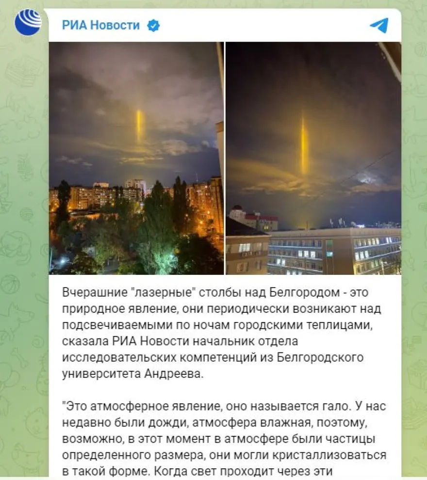Το φαινόμενο παρατηρείται συχνά σε αρκετά βόρειες τοποθεσίες ,κυρίως δε σε πόλεις. Μοιάζουν με δέσμες φωτός που εκλύονται από σταθερή αφετηρία, με κάθετη κατεύθυνση προς το διάστημα. Κάποιος θα μπορούσε να φανταστεί εύκολα πώς πρόκειται για μία ανθρωπογενή πηγή ενέργειας. Άρα θα μπορούσε να ήταν και κάποιο μυστικό όπλο. Εύκολα παραμύθια. Έτσι φθάσαμε στο μυστικό «όπλο» του Πούτιν που επιδείχθηκε τάχα στο Μπέλγκοροντ. Μόνον που το «συμπαντικό» μυστικό «όπλο» ήταν εντυπωσιακοί μεν πλην όμως αθώοι, παγωμένοι και διάφανοι κρύσταλλοι.