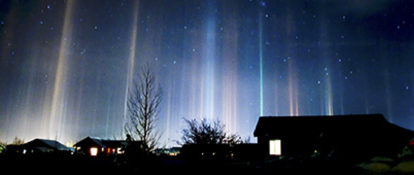 Το ξέρουμε ως φαινόμενο «light pillar». Πρόκειται για μία κάθετη σωρό παγωμένων κρυστάλλων που αιωρείται από το έδαφος με κατεύθυνση τον ουρανό. Πρέπει ωστόσο να υπάρχει μία πηγή φωτός ώστε να φωτιστεί αυτή η κολόνα κρυστάλλων.
