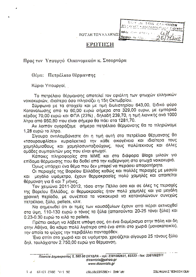 Η μισή σχεδόν δύναμη της Νέας Δημοκρατίας ζητάει από τον υπουργό Οικονομικών Γιάννη Στουρνάρα να μάθει τι θα γίνει εν όψει του χειμώνα με το πετρέλαιο θέρμανσης ειδικά στις περιοχές που έχουν εξαιρετικά χαμηλές θερμοκρασίες.