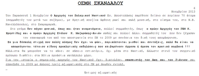 Ηχηρή ήταν η απουσία του πρώην αρχηγού του ΓΕΝ κ. Κ. Χρηστίδη και του πρώην αρχηγού Στόλου κ. Κ. Μαζαράκη-Ανιάν, όπως και άλλων, οι οποίοι, όπως λένε οι κακές γλώσσες, δεν μπόρεσαν να «ξεχάσουν» την επαναφορά του κ. Αποστολάκη από την αποστρατεία του στο ΠΝ το 2009 που είχε ως συνέπεια την δική τους απομάκρυνση.