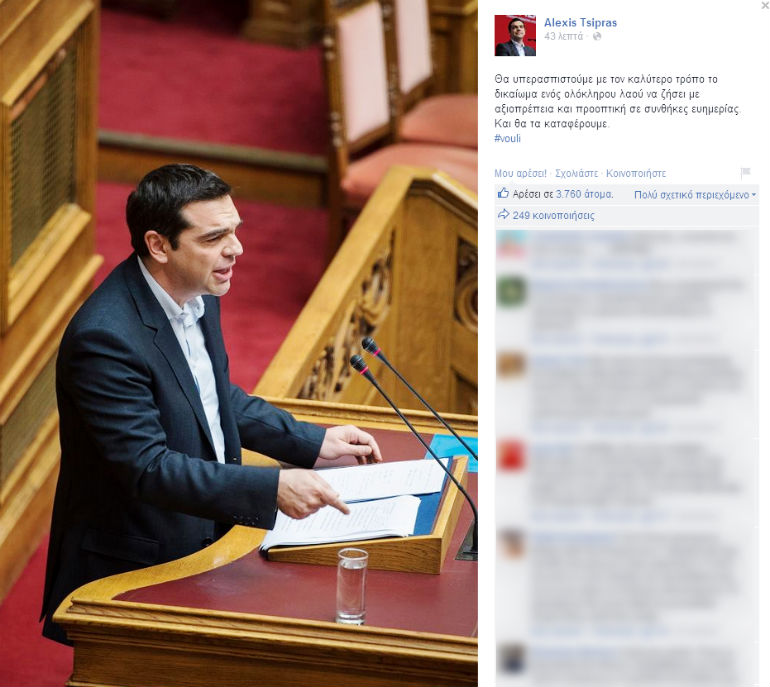 «Θα υπερασπιστούμε με τον καλύτερο τρόπο το δικαίωμα ενός ολόκληρου λαού να ζήσει με αξιοπρέπεια και προοπτική σε συνθήκες ευημερίας. Και θα τα καταφέρουμε», σχολίασε στον προσωπικό του λογαριασμό στο Facebook ο πρωθυπουργός, Αλέξης Τσίπρας, μετά την ολοκλήρωση της ομιλίας του στη Βουλή.