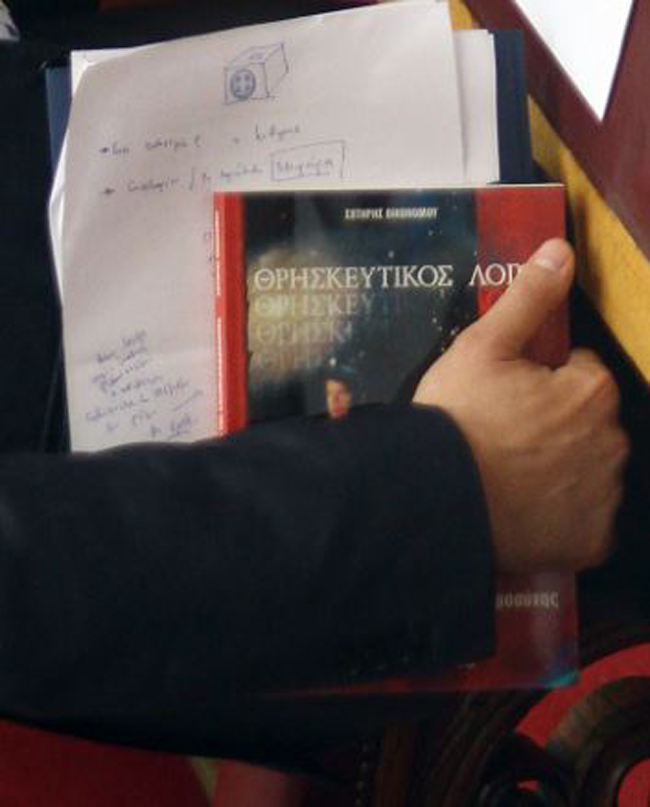 Βιβλίο με τίτλο «Θρησκευτικός Λόγος. Το χαλινάρι της ελευθεροφροσύνης» του Σωτήρη Οικονόμου φωτογραφήθηκε να κρατάει ο πρωθυπουργός Αλέξης Τσίπρας κατά τη διάρκεια της συνεδρίασης στη βουλή για την «Ώρα του πρωθυπουργού».