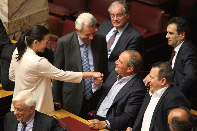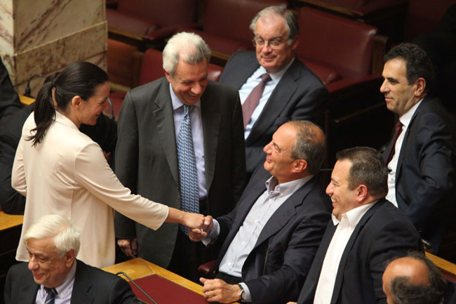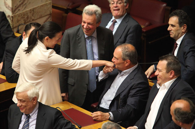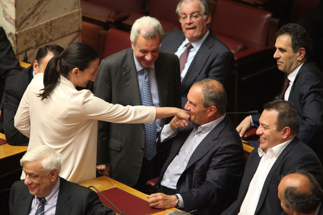 Ο κ. Καραμανλής, αρκετά ευδιάθετος, δεν δίστασε να φιλήσει το χέρι της ωραίας υπουργού ενώπιον της Ολομέλειας, όταν εκείνη τον πλησίασε για να τον χαιρετήσει.