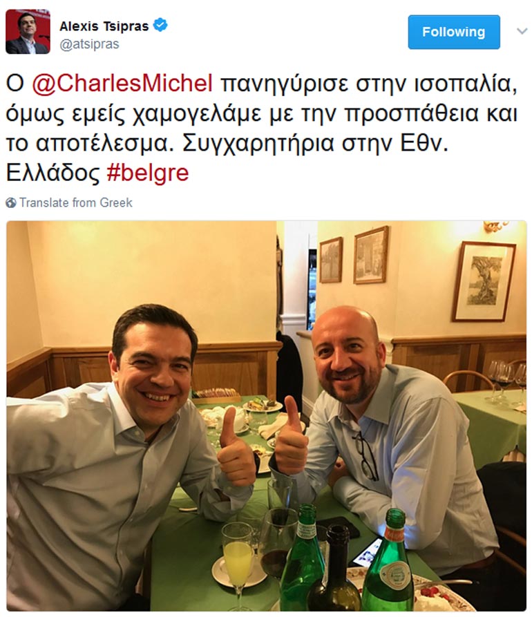 «Ο @CharlesMichel πανηγύρισε στην ισοπαλία, όμως εμείς χαμογελάμε με την προσπάθεια και το αποτέλεσμα. Συγχαρητήρια στην Εθν. Ελλάδος #belgre» αναφέρει χαρακτηριστικά το tweet του Αλέξη Τσίπρα.