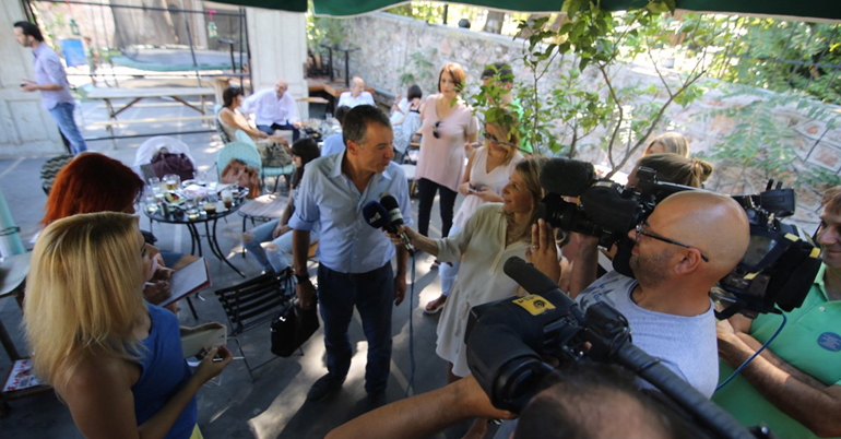 Ο πρόεδρος του ΣΥΡΙΖΑ έφτασε ευδιάθετος λίγο μετά τις 13:00 στο καφέ, όπου τον περίμενε, εκτός από τους νέους, και η περιφερειάρχης Αττικής Ρένα Δούρου.