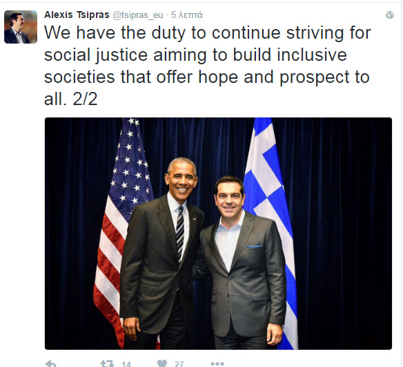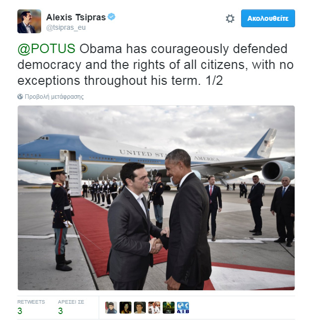 «Αποχαιρετούμε τον πρόεδρο Ομπάμα που εργάστηκε με σθένος για τη δημοκρατία & τα δικαιώματα όλων ανεξαρτήτως καταγωγής, θρησκείας ή φύλου», έγραψε ο Αλέξης Τσίπρας στο Twitter και συμπλήρωσε: