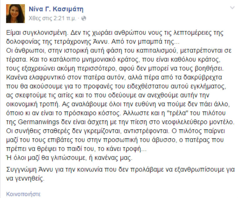 Κανένα ελαφρυντικό στον πατέρα αυτόν, αλλά πέρα από τα δακρύβρεχτα που θα ακούσουμε για το προφανές του ειδεχθέστατου αυτού εγκλήματος, ας σκεφτούμε τις αιτίες και το που οδεύουμε αν ανεχθούμε αυτήν την οικονομική τροπή. Ας αναλάβουμε όλοι την ευθύνη να πούμε δεν πάει άλλο, όποιο κι αν είναι το πρόσκαιρο κόστος. Άλλωστε και η “τρέλα” του πιλότου της Germanwings δεν είναι άσχετη με την πίεση στο νεοφιλελεύθερο μοντέλο.