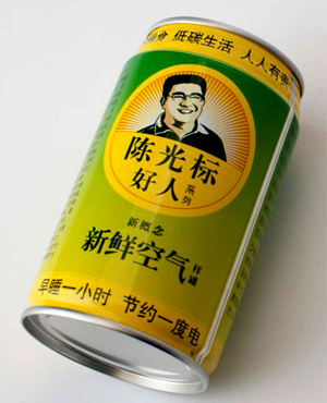 Ο Guangbiao Chen, εκμεταλλευόμενος, αφ΄ενός μεν την τραγική αύξηση της ρύπανσης στη χώρα του, και αφ΄ετέρου την εξ ίσου τραγική αύξηση της …βλακείας κάποιων εκατομμυρίων συμπατριωτών του, πουλάει …άδεια τσίγκινα κουτάκια τα οποία σύμφωνα με τις δηλώσεις του, (τις οποίες φυσικά δεν έχουμε και κανένα λόγο να αμφισβητήσουμε), έχουν σφραγιστεί σε περιοχές της Κίνας οι οποίες έχουν …καθαρό αέρα!