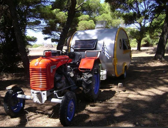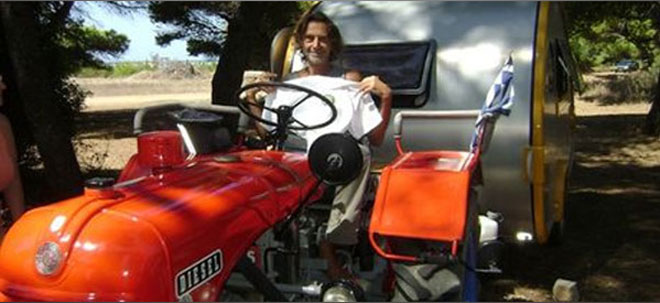 Συνταξιούχος τυπογράφος πια, έχει αρκετό ελεύθερο χρόνο στη διάθεσή του για ταξίδια. Μέχρι πέρυσι ερχόταν στη χώρα μας με αυτοκίνητο ή μηχανή, αλλά φέτος είπε να κάνει κάτι διαφορετικό και ταξίδεψε μέχρι εδώ με τρακτέρ, με το οποίο έσερνε το μικρό τροχόσπιτό του.
