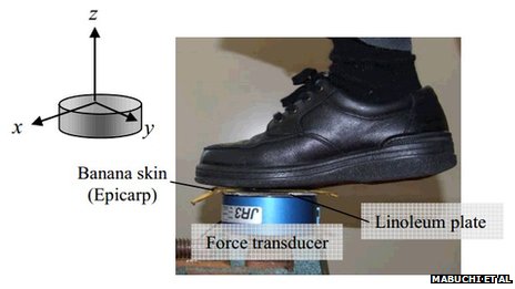 Πειράματα (με ανθρώπους που συνεχώς γλιστρούσαν στο πάτωμα…) έδειξαν ότι, αν πατήσει μπανανόφλουδα, το πόδι θα γλιστρήσει αν η κάθετός του σχηματίζει γωνία με το πάτωμα μεγαλύτερη από 3,8 μοίρες. Επιπλέον, διαπίστωσαν ότι η φλούδα του μήλου έχει τριβή 60% μεγαλύτερη από τη μπανανόφλουδα, γι’ αυτό γλιστράει πολύ λιγότερο.