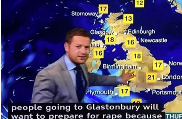 Προφανώς οι άνθρωποι που γράφουν τους υπότιτλους στο δελτίο καιρού μπέρδεψαν την λέξη rape= βιασμός με την λέξη rain = βροχή, με αποτέλεσμα η φράση να μεταφράζεται: «οι άνθρωποι που θα πάνε στο Glastonbury να προετοιμαστούν για βιασμό» αντί για βροχή!
