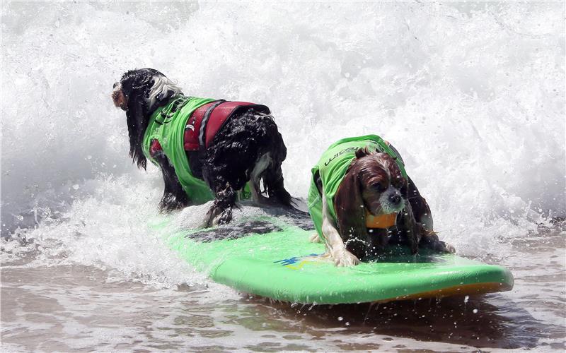 Περισσότερα από 50 σκυλάκια διαγωνίζονται στα κύματα της Καλιφόρνια στο πλαίσιο ενός διαγωνισμού σέρφιγνκ για σκύλους.