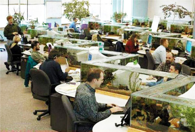 Δεξαμενές με διάφορα είδη ψαριών τοποθετήθηκαν πάνω στα γραφεία, δημιουργώντας ένα ήρεμο περιβάλλον εργασίας για τους υπαλλήλους, οι οποίοι έχουν καθημερινά να αντιμετωπίσουν τα απανωτά χτυπήματα των τηλεφώνων από τους πελάτες της εταιρείας.