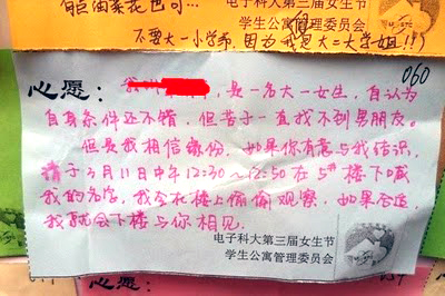 «Είμαι η Zhang και νομίζω πως είμαι όμορφη, αλλά δεν μπορώ να βρω κάποιον να με αγαπήσει. Όμως πιστεύω στη μοίρα και περιμένω να πραγματοποιηθεί η ευχή μου – ένα αγόρι να έρθει κάτω από το παράθυρό μου και να φωνάξει το όνομά μου! Αν θέλεις, θα σε περιμένω στις 11 Μαρτίου. Φώναξέ με και θα σε βάλω κρυφά στο δωμάτιο στην εστία μου».