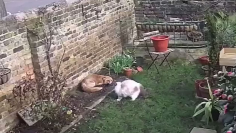 Μια αλεπού περπατούσε πάνω στον τοίχο μιας ιδιοκτησίας και πήδηξε μέσα στον κήπο. Μόλις προσγειώθηκε στο έδαφος, η Mindy, η γάτα, πήδηξε αμέσως να της επιτεθεί για να προστατέψει το σπίτι της. Μετά από μερικά δευτερόλεπτα, πρόσωπο με πρόσωπο, η αλεπού προτίμησε να φύγει.