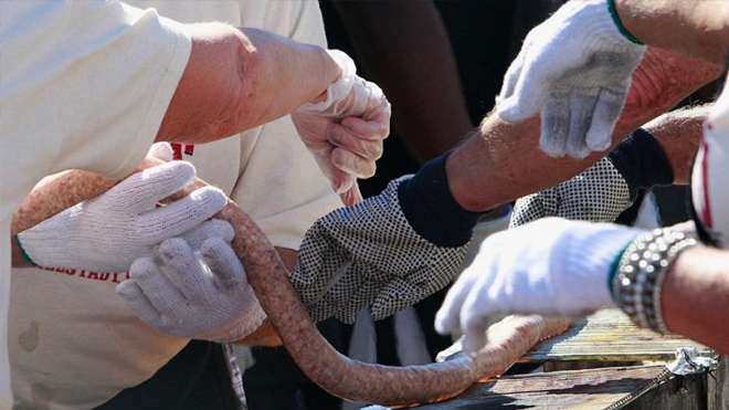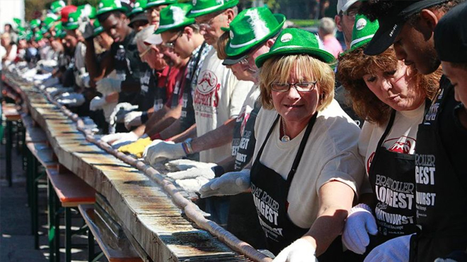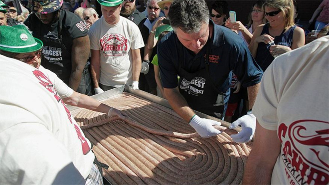 Μουσική, χορός και εκλεκτοί μεζέδες κυριάρχησαν στις εορταστικές εκδηλώσεις στο Μπέλβιλ. Κορυφαία στιγμή της ημέρας… ένα λουκάνικο μήκους 200 ποδιών (62 μέτρων), το οποίο ζύγιζε περίπου 120 κιλά. Για τη μεταφορά και την τοποθέτησή του πάνω στη σχάρα χρειάστηκε η συνδρομή δεκάδων πολιτών.