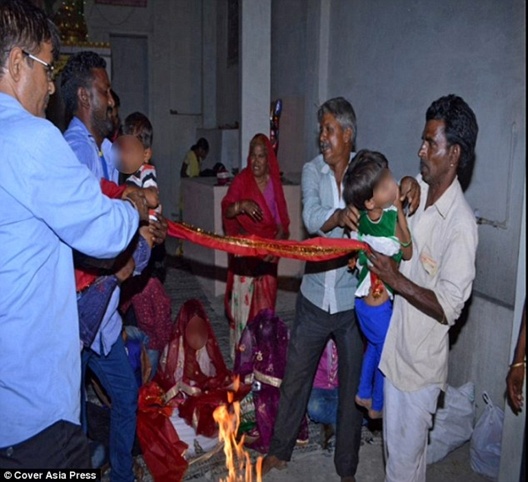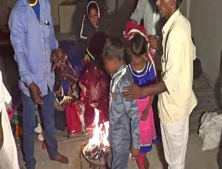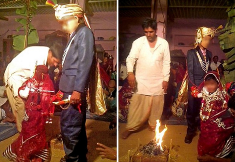 Στο παρακάτω βίντεο μία από τις νύφες, που δεν είναι πάνω από πέντε ετών, φαίνεται να φοράει ένα ινδουιστικό νυφικό φόρεμα και να εξαναγκάζεται να περπατήσει γύρω από τη φωτιά, παρέα με τον… γαμπρό, ο οποίος είναι μόλις 11 ετών.