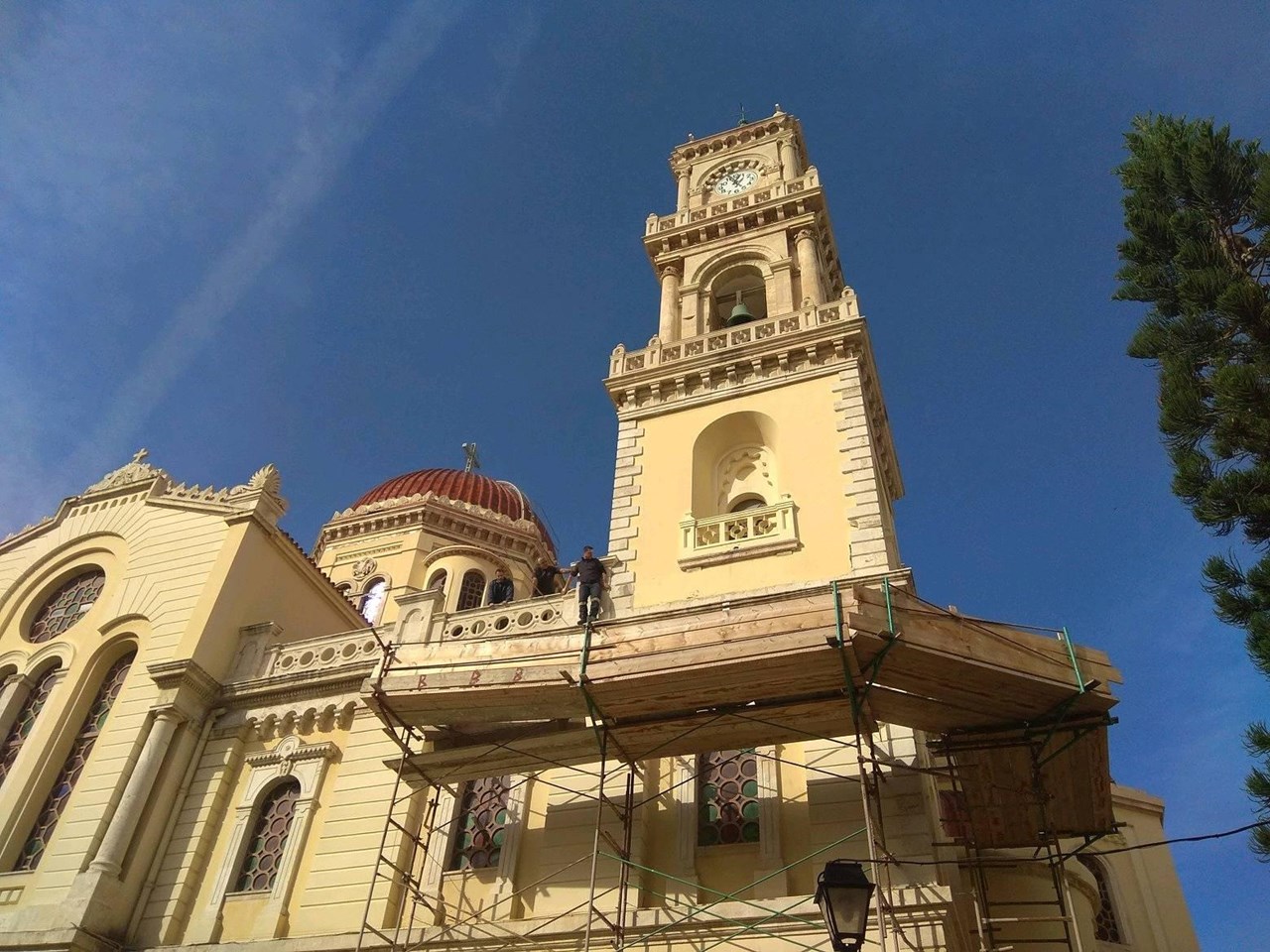 Οι πυροσβέστες έσπευσαν στο σημείο και ανέβηκαν στην κορυφή του ναού ενώ – όπως μαρτυρούν και οι φωτογραφίες της Φανής Καλαθάκη – δεν δίστασαν να πατήσουν πάνω στην σκαλωσιά για να εντοπίσουν και να διασώσουν το γατάκι.