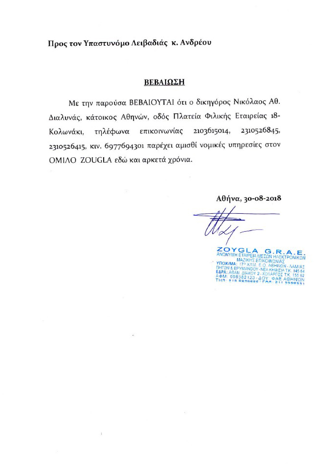 Σήμερα, 30 Αυγούστου 2018, πρωινές ώρες επικοινώνησε με τα γραφεία του zougla.gr Υπαστυνόμος από τη Διεύθυνση Ασφαλείας Λειβαδιάς και ζήτησε να τους αποστείλουν βεβαίωση ότι ο Δικηγόρος Νικόλαος Διαλυνάς είναι δικηγόρος-νομικός σύμβουλος της ιστοσελίδας καθώς είχε εντοπιστεί το εν λόγω τηλεφώνημα στα γραφεία του zougla.gr.
