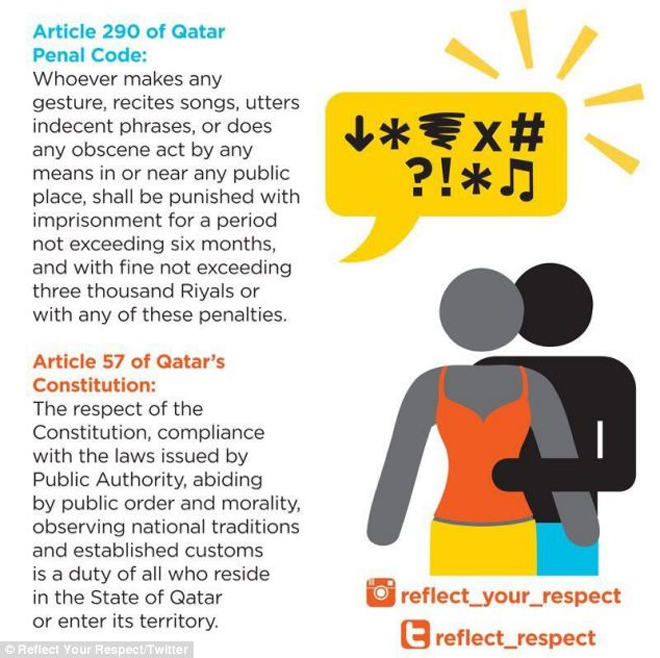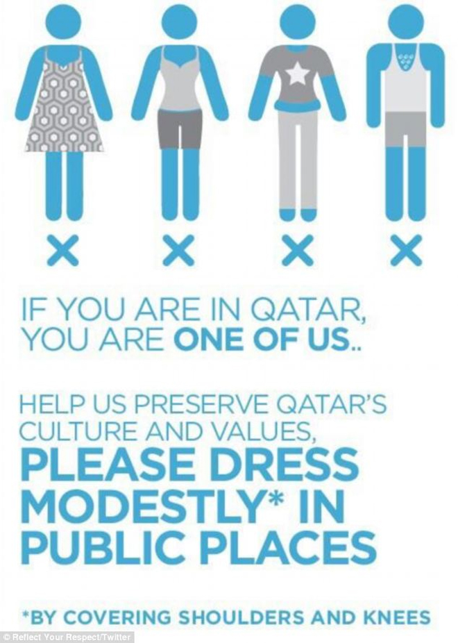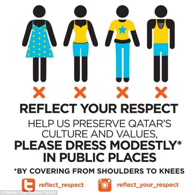 «Δείξε τον σεβασμό σου», «Βοήθησέ μας να διατηρήσουμε τον πολιτισμό και τις αξίες του Κατάρ» και «Ντύσου ευπρεπώς σε δημόσιους χώρους», είναι μερικά μόνο από τα μηνύματα που αναγράφονται στα ενημερωτικά για τους τουρίστες φυλλάδια.