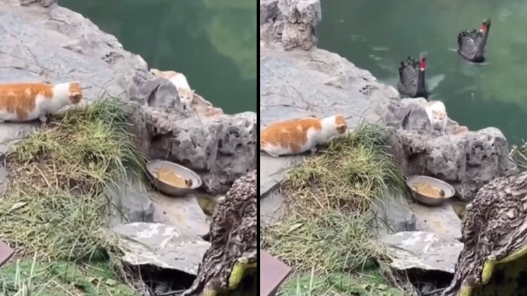 Δίπλα σε μια λίμνη, δύο γάτες παραμονεύουν για να πιάσουν ένα σπουργίτι. Τότε ένας κύκνος έρχεται να τους καταστρέψει τα σχέδια.