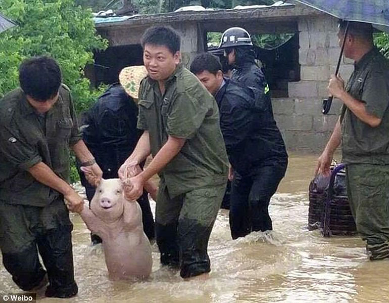 Τον γύρο του διαδικτύου έκανε στη Κίνα η φωτογραφία ενός χοιρίδιου το οποίο πόζαρε χαμογελαστό τη στιγμή που οι διασώστες το απομάκρυναν από πλημμυρισμένη περιοχή, λόγω των καταρρακτωδών βροχών που έπληξαν το νότιο τμήμα της Κίνας, στην αυτόνομη περιοχή Κουανγκσί Τσουάνγκ.