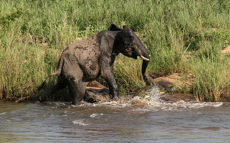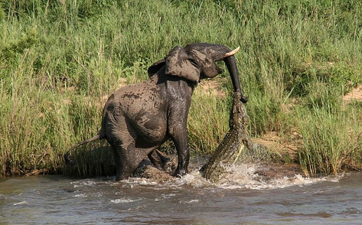 Ένας ελέφαντας απολάμβανε το μπάνιο του σε μια λίμνη ενός πολυτελούς πάρκου άγριων ζώων στη Νότια Αφρική όταν ξαφνικά ένιωσε έναν οξύ πόνο στην προβοσκίδα του. Ένας κροκόδειλος τεσσάρων μέτρων άρπαξε με τα κοφτερά του δόντια αυτό το πολύτιμο όργανο του τεράστιου ζώου αιφνιδιάζοντας τον ελέφαντα.