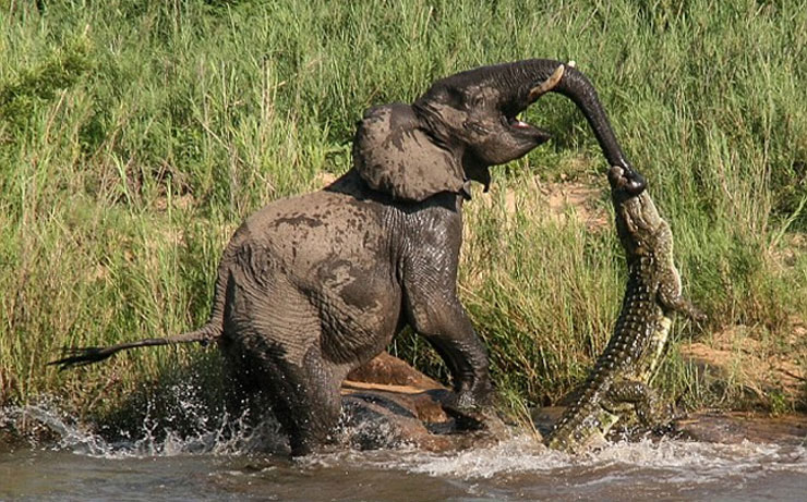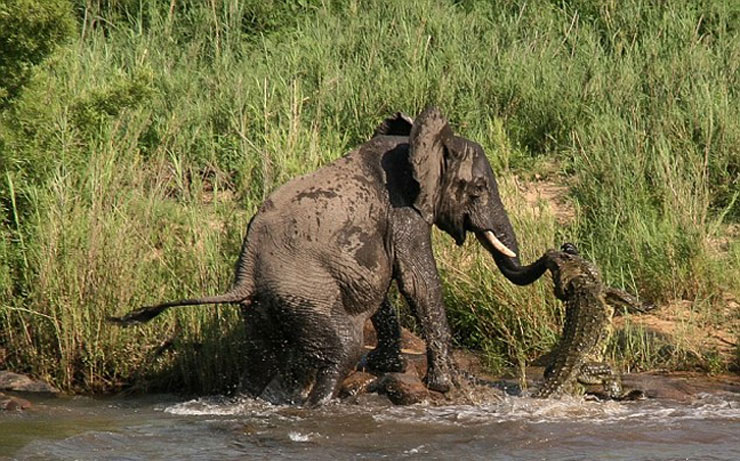 Ένας ελέφαντας απολάμβανε το μπάνιο του σε μια λίμνη ενός πολυτελούς πάρκου άγριων ζώων στη Νότια Αφρική όταν ξαφνικά ένιωσε έναν οξύ πόνο στην προβοσκίδα του. Ένας κροκόδειλος τεσσάρων μέτρων άρπαξε με τα κοφτερά του δόντια αυτό το πολύτιμο όργανο του τεράστιου ζώου αιφνιδιάζοντας τον ελέφαντα.
