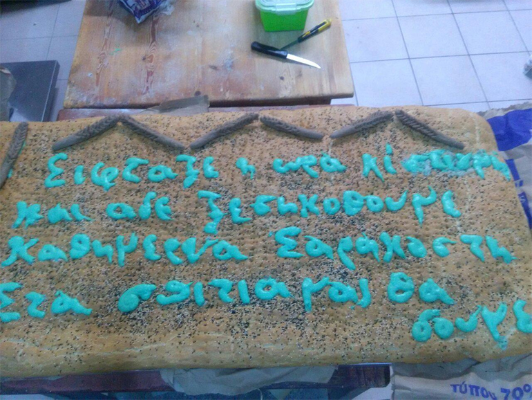 στα σπίτια μας θα δούμε» αναφέρει η μαντινάδα που είναι γραμμένη πάνω στο παραδοσιακό αρτοσκεύασμα.