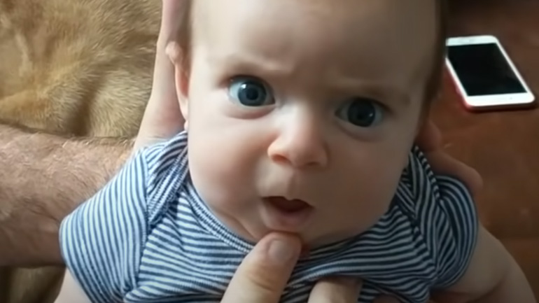 Με ένα βλέμμα γεμάτο απορία, το μωρό συμμετέχει στο παιχνίδι που παίζει ο μπαμπάς καθώς του δίνει φωνή και ανοιγοκλείνει το στόμα του...