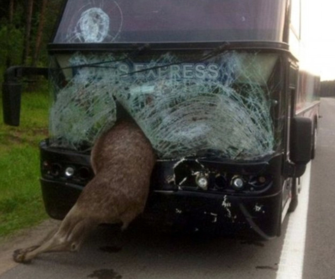 Ένα πρωτοφανές τροχαίο σημειώθηκε σε εθνική οδό της Λευκορωσίας, όταν μια Άλκη, ένα είδος ελαφιού, βρέθηκε στη μέση του δρόμου με αποτέλεσμα να καρφωθεί στο παρμπρίζ διερχόμενου λεωφορείου.