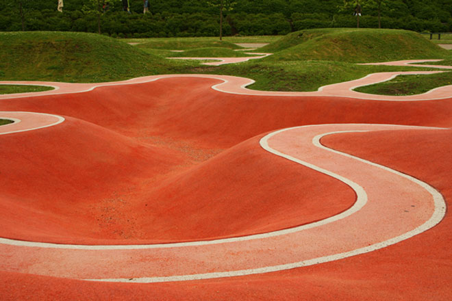 Το μόνο που θα διακρίνει κάποιος στο εσωτερικό της είναι κόκκινο ταρτάν και καταπράσινο γρασίδι να δημιουργούν εντυπωσιακά μονοπάτια, τα οποία καταλήγουν σε υψώματα ή σε βαθουλώματα!