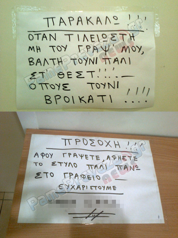Μια ιδιαίτερη πινακίδα εντόπισε ο φωτογραφικός φακός του pamepreveza.gr σε δημόσια υπηρεσία στην Πρέβεζα. Η… χάρτινη πινακίδα απευθύνει με αρκετή δόση χιούμορ μια έκκληση προς τους πολίτες και σίγουρα δεν θα μπορούσε να περάσει απαρατήρητη.