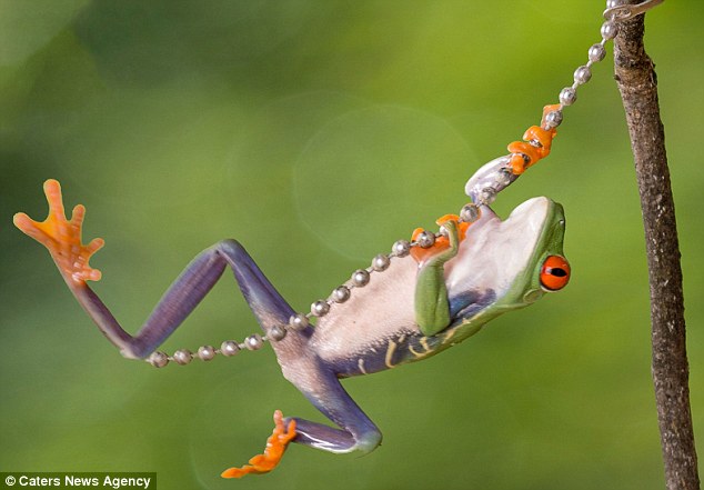 Ξετρελαμένος δείχνει με την αλυσιδίτσα που του επιτρέπει να κάνει κούνια και να πηδάει από το ένα κλαδί στο άλλο. Ο λόγος για τον κατοικίδιο βάτραχο ονόματι Prince του φωτογράφου Kutub Uddin, o οποίος κατάγεται από το Μπαγκλαντές αλλά ζει στο Δυτικό Σάσεξ της Αγγλίας.