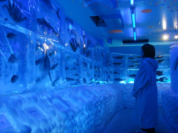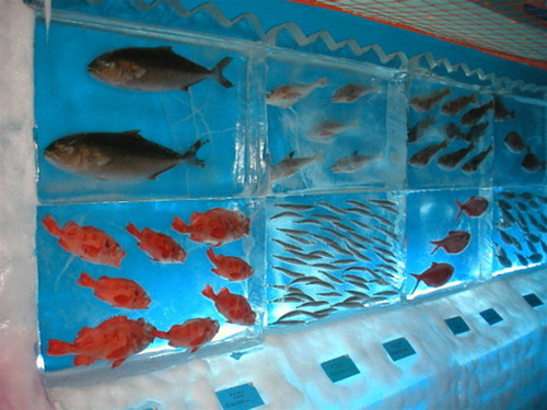 To «Kori de no Suizokukan» (Παγωμένο ενυδρείο) στην Kesennuma της Ιαπωνίας περιέχει περίπου 50 κολώνες πάγου με χταπόδια, καβούρια, σολομούς και άλλα θαλάσσια είδη.