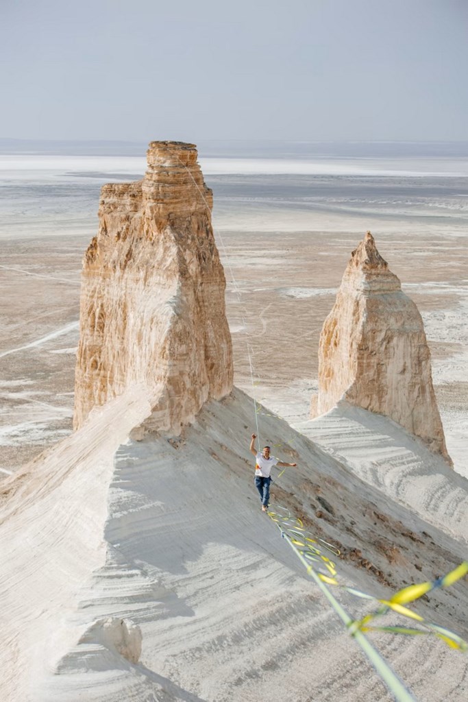 Στην καρδιά της περιοχής που ονομάζεται Bozzhyra στην επικράτεια του Mangystau μπορείτε να βρείτε δύο εντυπωσιακούς βράχους γνωστούς και ως τα δόντια. Σε αυτές τις κολώνες από ασβεστόλιθο ο Roose τέντωσε το slackline του και έγινε ο πρώτος άνθρωπος που έκανε αυτό το εναέριο πέρασμα.