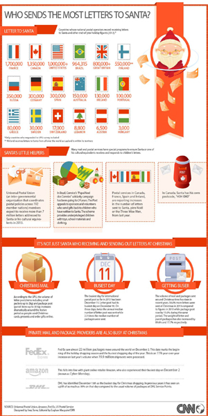 Τα παιδιά από τη Γαλλία είναι αυτά που περιμένουν… περισσότερα από τον Άγιο Βασίλη (1,7 εκατομμύρια γράμματα), ακολουθούν οι Καναδοί (1,35 εκατομμύρια γράμματα -εκεί μάλιστα ο Άγιος Βασίλης έχει τον δικό του ταχυδρομικό κώδικα ο οποίος είναι «HOH OHO»!) και οι ΗΠΑ με 1 εκατομμύριο γράμματα.