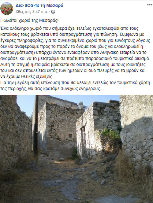Ένα ολόκληρο χωριό στο οποίο πια δεν κατοικεί κανείς, βρίσκεται υπό διαπραγμάτευση προς πώληση. Όπως αναφέρει σε ανάρτηση της στο facabook, η σελίδα, «Δια-SOS-τε τη Μεσαρά», το συγκεκριμένο χωριό, δεν κατοικείται εδώ και χρόνια, οπότε και μία Αθηναική εταιρεία, είναι σε συζητήσεις προκειμένου να προχωρήσει στην εξαγορά του. Η εταιρεία, επιθυμεί να το μετατρέψει σε παραδοσιακό τουριστικό οικισμό.