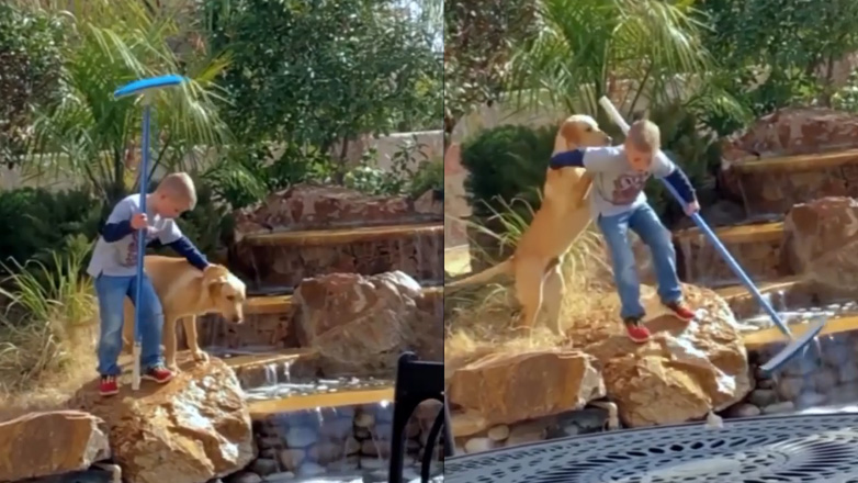 Ένα μικρό αγόρι σπρώχνει τον σκύλο του με στόχο να τον ρίξει μέσα στο νερό
