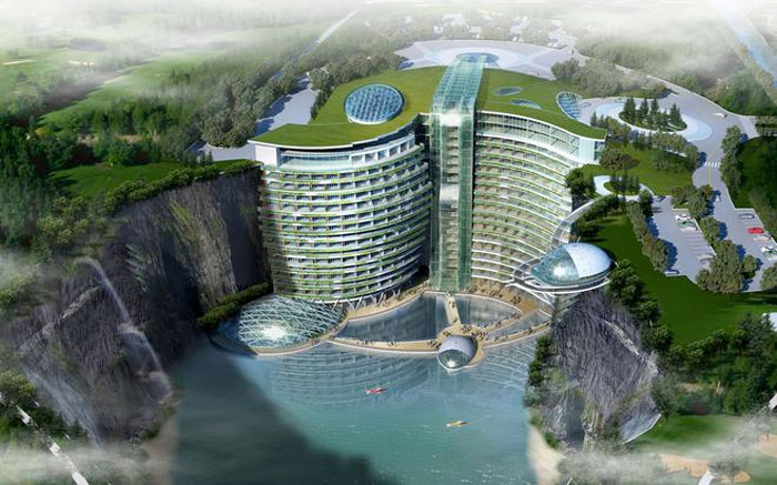 Ξεκινώντας από τη βάση του βουνού, το συγκρότημα θα χτιστεί σε ένα παλιό ορυχείο σε βάθος 100 μέτρων, το οποίο μάλιστα διαθέτει και νερό. Σχεδιασμένο από την εταιρεία Atkins, το νέο κτιριακό επίτευγμα θα διαθέτει 380 δωμάτια μοιρασμένα σε 19 ορόφους. Δύο όροφοι θα βρίσκονται κάτω από τη στάθμη του νερού, ενώ θα υπάρχει ενυδρείο, υποβρύχιο εστιατόριο και φυσικά υποβρύχια δωμάτια. Το ξενοδοχείο θα είναι ορατό μόνο από την κοιλότητα του ορυχείου ενώ εξωτερικά θα είναι σχεδόν αφανές, αφού θα προεξέχει μόνο 15 μέτρα από το ύψος του εδάφους. Ακριβώς απέναντί του και σε ίδιο ύψος, στο άλλο άκρο του κρατήρα, θα βρίσκεται ένας εντυπωσιακός καταρράκτης, προσφέροντας μαγευτικό θέαμα στους ενοίκους.