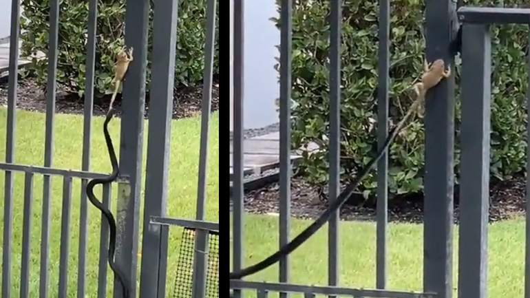 Σε ένα φράχτη, ένα φίδι έχει αρπάξει έναν βάτραχο από το πόδι, αλλά το θήραμά του παλεύει με όλη του τη δύναμη για να επιβιώσει και καταφέρνει να φύγει και να σκαρφαλώσει τελικά στον τοίχο του σπιτιού.