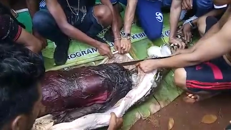 Σε ένα ανατριχιαστικό βίντεο που δημοσιεύτηκε από κάποια περιοχή της Αφρικής, απεικονίζεται η συγκλονιστική στιγμή κατά την οποία πολίτες, παρουσία των Αρχών, «ανοίγουν» με μαχαίρια έναν νεκρό πύθωνα.