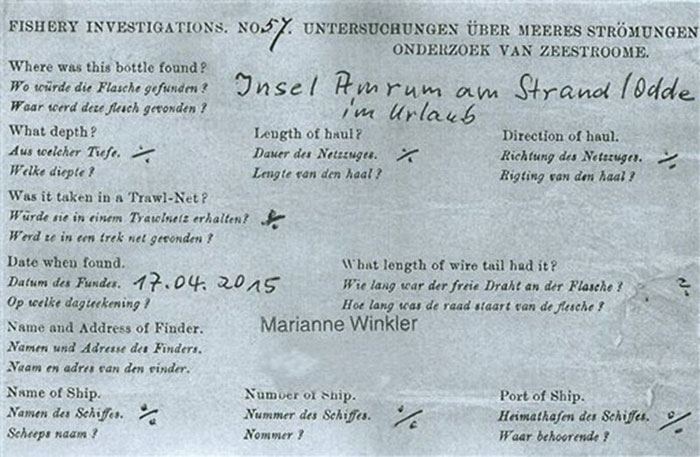 Ο αποστολέας του το πέταξε στη Βόρεια Θάλασσα κάπου μεταξύ 1904 και 1906 και το μπουκάλι ξεβράστηκε στην παραλία του γερμανικού νησιού Amrum. Το βρήκε ένα ζευγάρι τον Απρίλιο.