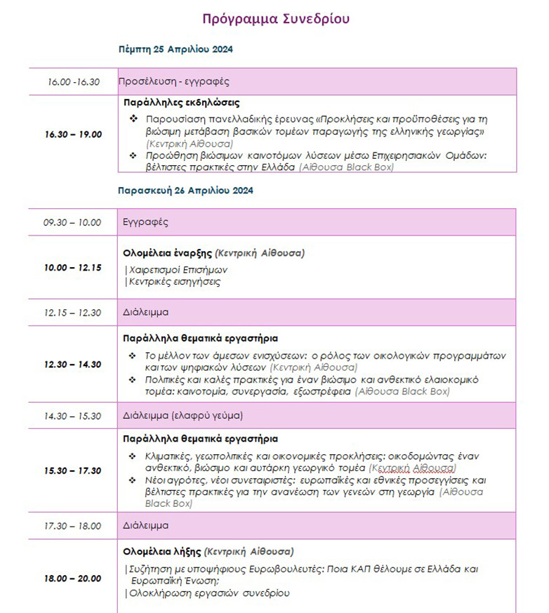 Επιπλέον, την παραμονή του Συνεδρίου, την Πέμπτη 25 Απριλίου, θα παρουσιαστούν τα αποτελέσματα της νέας πανελλαδικής έρευνας – μελέτης της GAIA ΕΠΙΧΕΙΡΕΙΝ, με θέμα «Προκλήσεις και προϋποθέσεις για τη βιώσιμη μετάβαση βασικών παραγωγικών τομέων της ελληνικής γεωργίας». Στο πλαίσιο της έρευνας – μελέτης, συγκεντρώθηκαν πολύτιμα στοιχεία σε σχέση με ζητήματα βιωσιμότητας που αντιμετωπίζουν οι παραγωγοί και τα συλλογικά σχήματα που δραστηριοποιούνται στους τομείς δημητριακών, οπωροκηπευτικών, ελαιοκομικών, αμπελοοινικών και γάλακτος/γαλακτοκομικών προϊόντων μέσω τηλεφωνικής έρευνας που πραγματοποιήθηκε σε συνεργασία με την ΚΑΠΑ Research, αλλά και μέσω της συλλογής και επεξεργασίας στοιχείων που πραγματοποίησαν τα στελέχη της GAIA EΠΙΧΕΙΡΕΙΝ και αφορούν στα βασικά οικονομικά μεγέθη των τομέων αυτών (εκτάσεις, παραγωγή, αξία κ.λπ.), τον βαθμό οργάνωσής τους και τη σχετική παρεχόμενη στήριξη της ΚΑΠ.